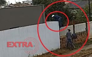 Vilhena, RO - A ação dos bandidos que pularam o muro de uma casa por volta das 14h30 de segunda-feira, 21, na Rua Wilson Monteiro com a Rua Azaléia, no Bairro Jardim das Oliveiras, em Vilhena, foi registrada por câmeras de segurança da empresa Camerite que desenvolve o projeto #eucolaboro.