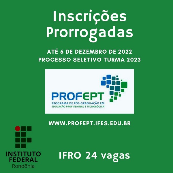 Vilhena, RO - Foi prorrogado até o dia 6 de dezembro o prazo para inscrições do Programa de Pós-Graduação em Educação Profissional e Tecnológica (ProfEPT) em Rede Nacional.
