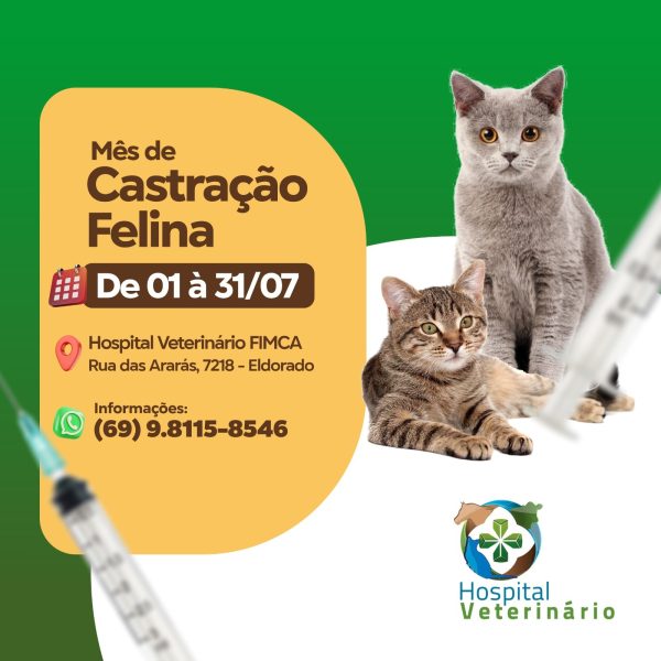 Para os moradores de Porto Velho e região, o Hospital Veterinário FIMCA está oferecendo um mês de castração de gatos de 01 a 31 de julho. Esta é uma excelente oportunidade para cuidar da saúde do seu gato e ajudar a controlar a população de felinos na cidade. Aproveite essa chance de proporcionar uma vida mais saudável e feliz ao seu pet. Para mais informações, entre em contato no WhatsApp: (69) 98115-8546.